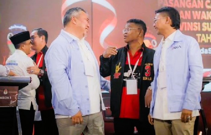 Mereka bertiga terlihat sempat berbincang. Foto ini diambil saat Ahmad Ali dan Abdul Karim usai menjabat tangan dengan Rusdy Mastura, yaitu ketika debat pilgub kedua telah selesai.